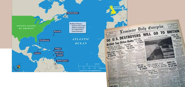 Under this arrangement, the U.S. transferred 50 aging but still serviceable destroyers to the British Royal Navy in exchange for access to British military bases in the Caribbean and Newfoundland. The transfer of destroyers significantly bolstered the British fleet, providing much-needed support in the Battle of the Atlantic.